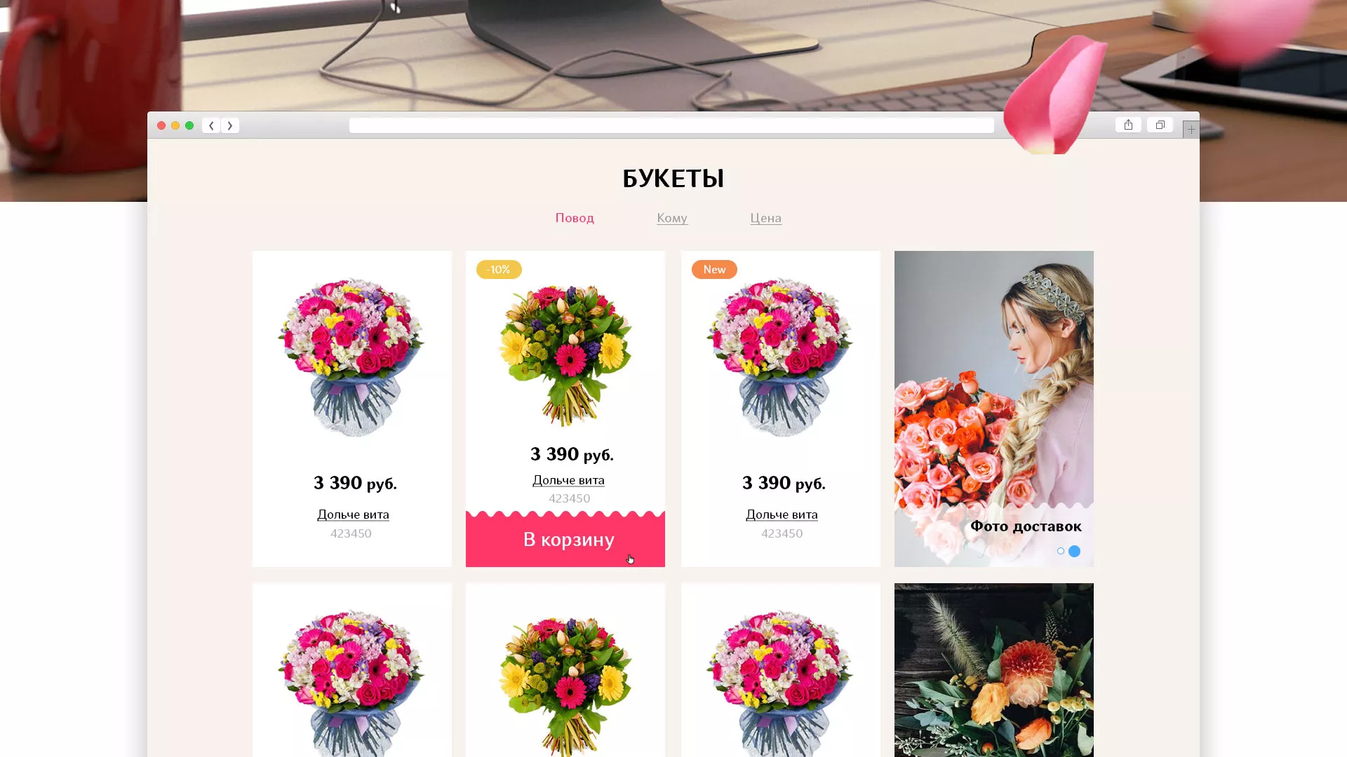 Создание интернет-магазина в Ковдоре для компании «Букет-онлайн» по продаже цветов, сопровождение сайта и его продвижение.